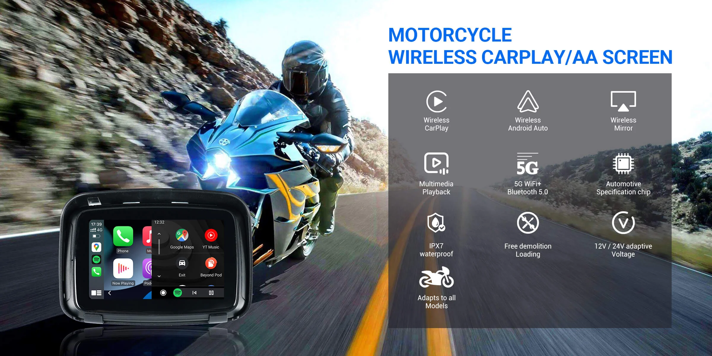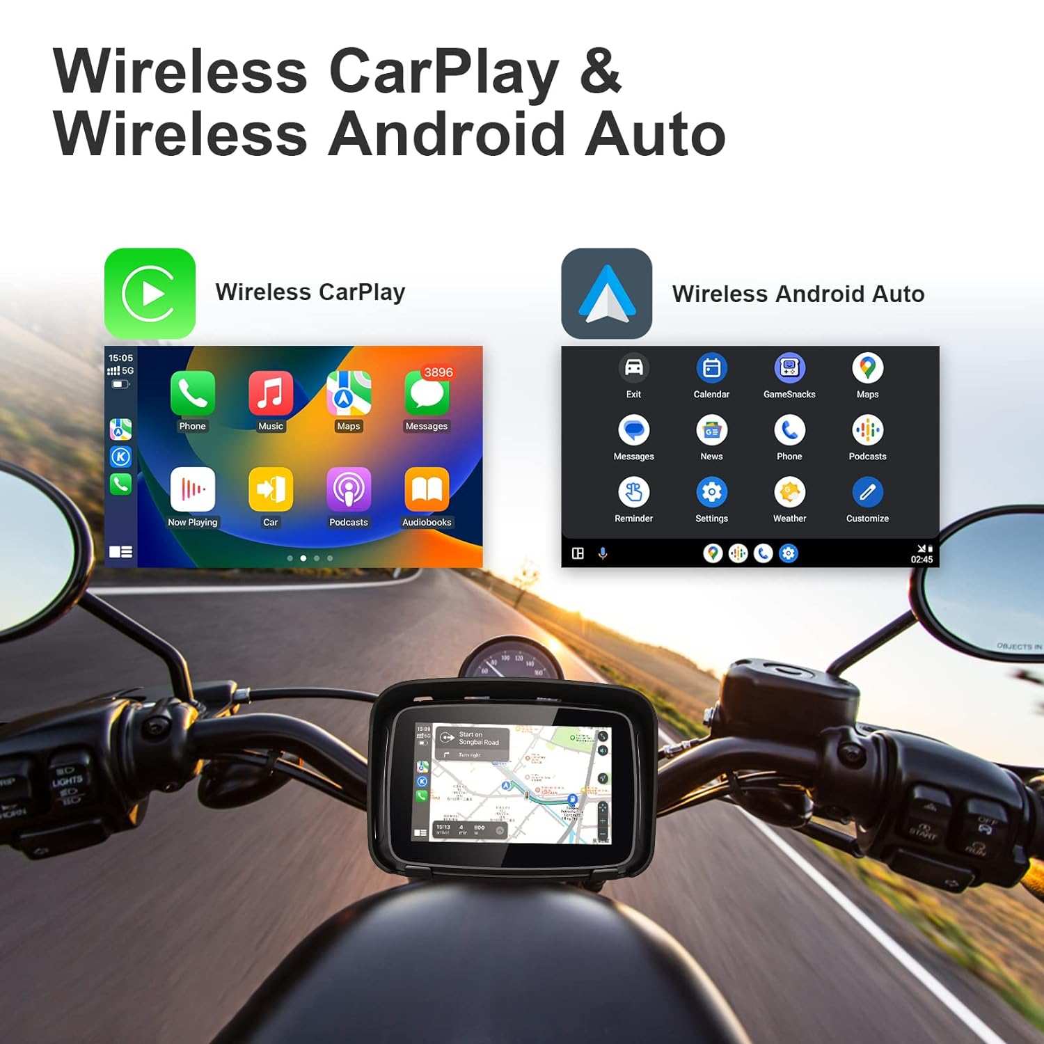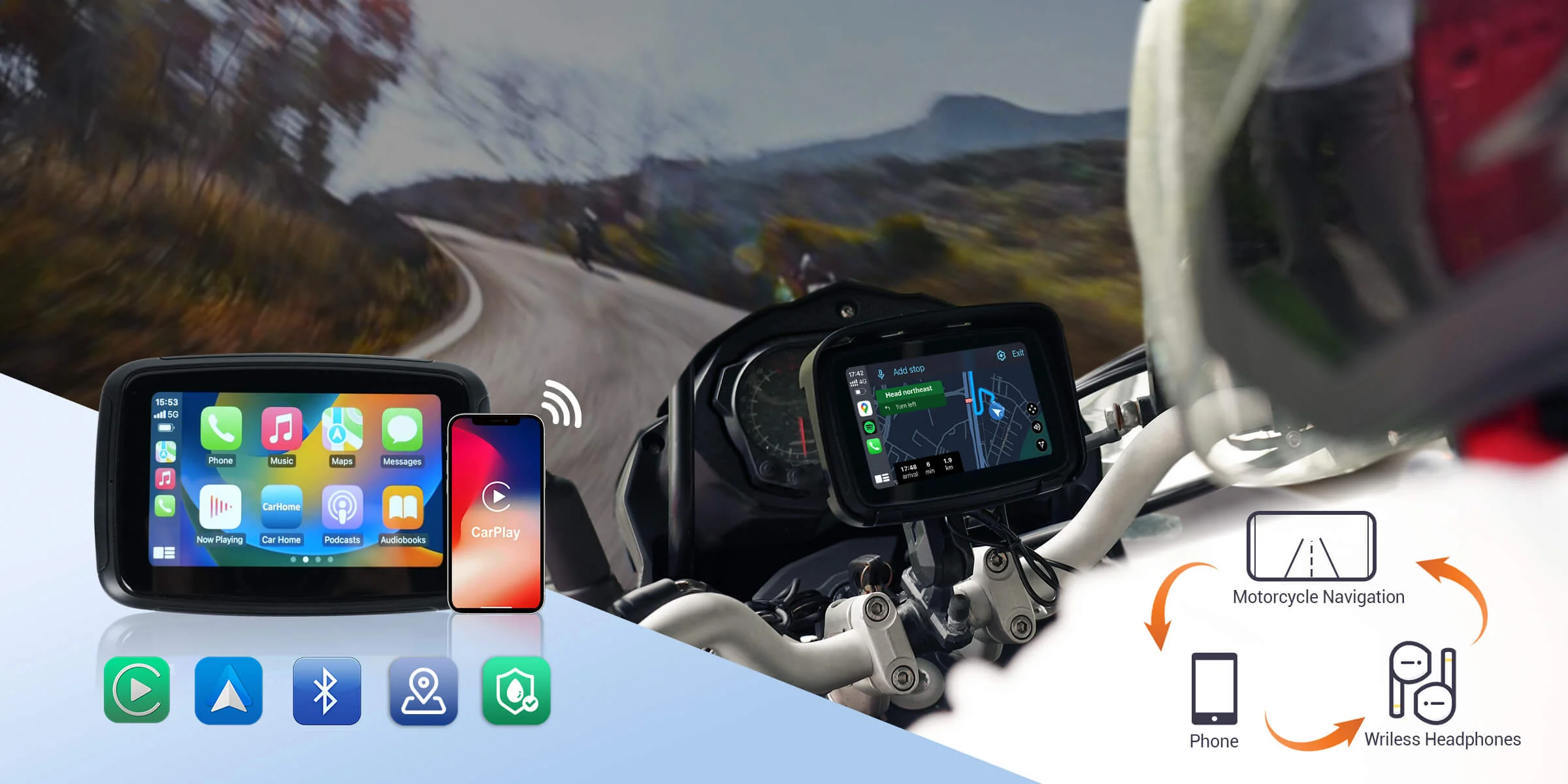 Motorcycle GPS Wireless Carplay/Android Auto Waterproof Screen
