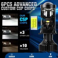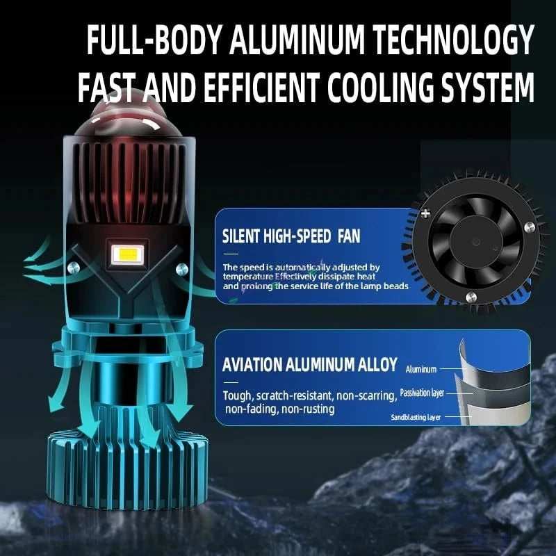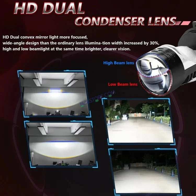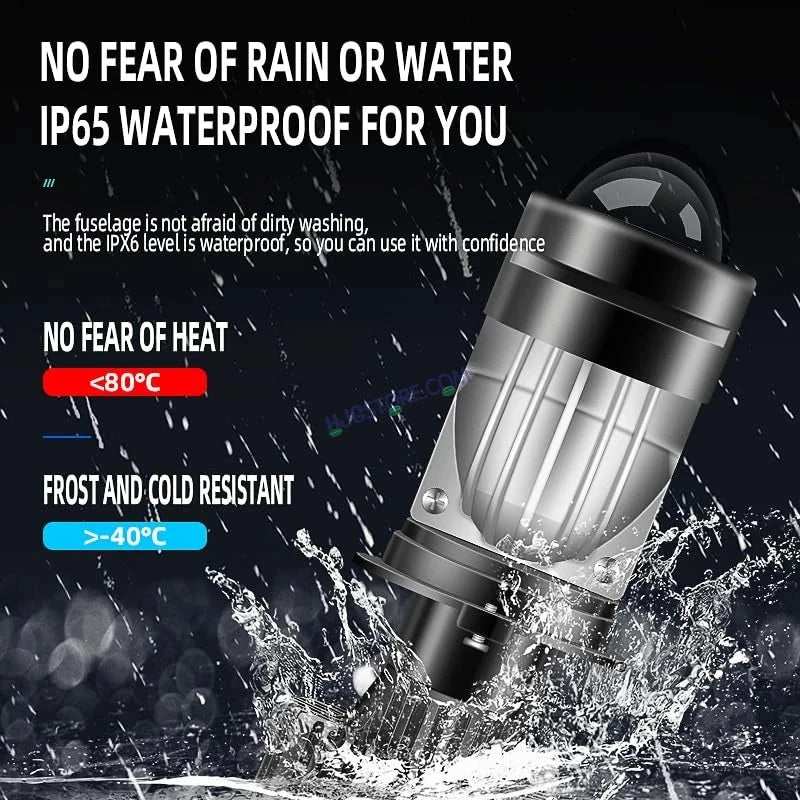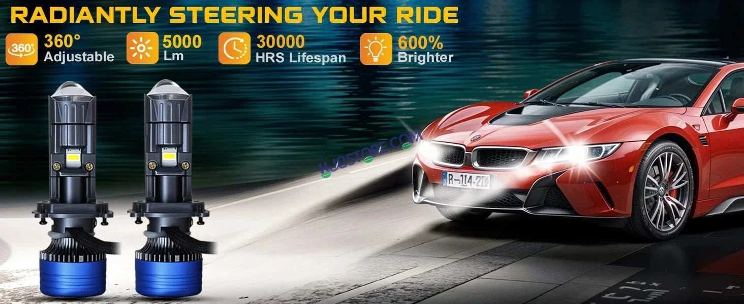 | HJG Projector Lens H4 LED Bulb 45W HJG Y6 Projector Light Lamp H4 LED Mini Projector Lens with Fan for Bike Bulb 7000LM Conversion Kit Hi/Lo Beam Headlight 12V/24V for Motorcycle, Set of 1, White HJG H4 Dual Y6 Condenser RTD Lens Dual Projector Lens Projector Lens LED Headlight Bulb for car | Hi/Lo Beam Headlight 12V-80V | 100W | 5000LM | 3 Pin Projector h4 Headlight with Fan | (Pack of 2) 1,H4 Bi-LED Mini Projector Lens Headlight Bulbs 2, LHD, Left Hand Drive, RHD Right Hand Drive Optional 3, Voltage: DC 9V-16V 4, Color Temperature: 6000K White 5, Power: 50W/piece, 100W/pair 6, Lamp model size: H4 7, Lumen: 12000LM 8, Install Method: Plug-and-play LED Headlight 9, Beam Type: Hi-Lo Beam 10, Lifespan: >30000 hours 11, Operating Temperature: -40?C ~ +80?C 12, Material: Aviation Aluminum, PC Lens 13, Suitable cars: Universal car. Also can fit motorcycle 14, Waterproof Rate: IP65 Product Features: 1, Upgrade Mini Size. Super Mini. Smaller than the old type. 2, Built-in, Mini Projector Lens, Crystal clear, more Concentrated light output. 3, Hi-Lo beam, Low beam clear cut-off line, will not dazzle on coming vehicle, Rectangle high beam take light to a great distance. 4, Connect wire cable, High temperature and waterproof, fast conduction, high power, steady current. 5, Plug and Play, easy to install. 6, Aviation aluminum body and built-in Fan, fast heat dissipation. 7, Decoding Function Constant current and temperature protect. Products include: 2pcs H4 lights for Left hand drive (The steering wheel is on the left and the car is driving on the right side of the road.)