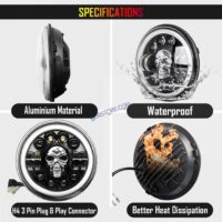 HJG 7 Inch Harley Skull Round Led Headlight Fits in Royal Enfield All Models, Mahindra Thar (12V-80V 75w)